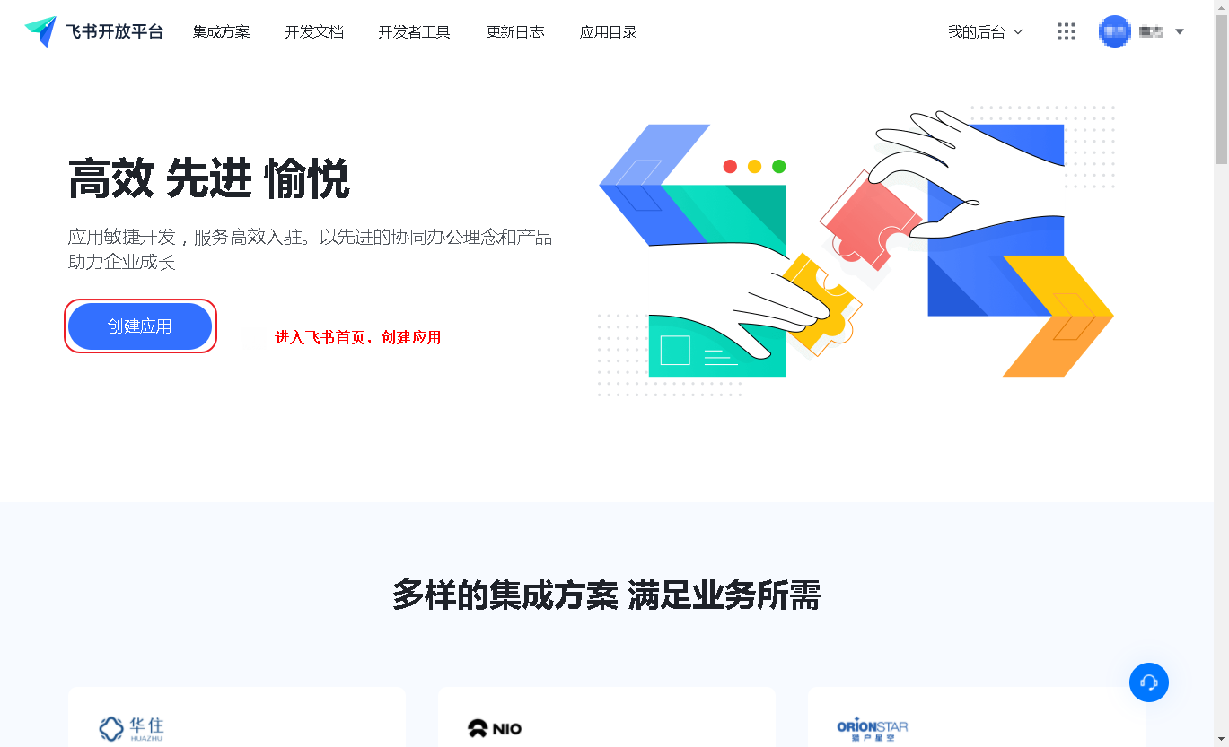 进入飞书开放平台首页,点击创建应用按钮。