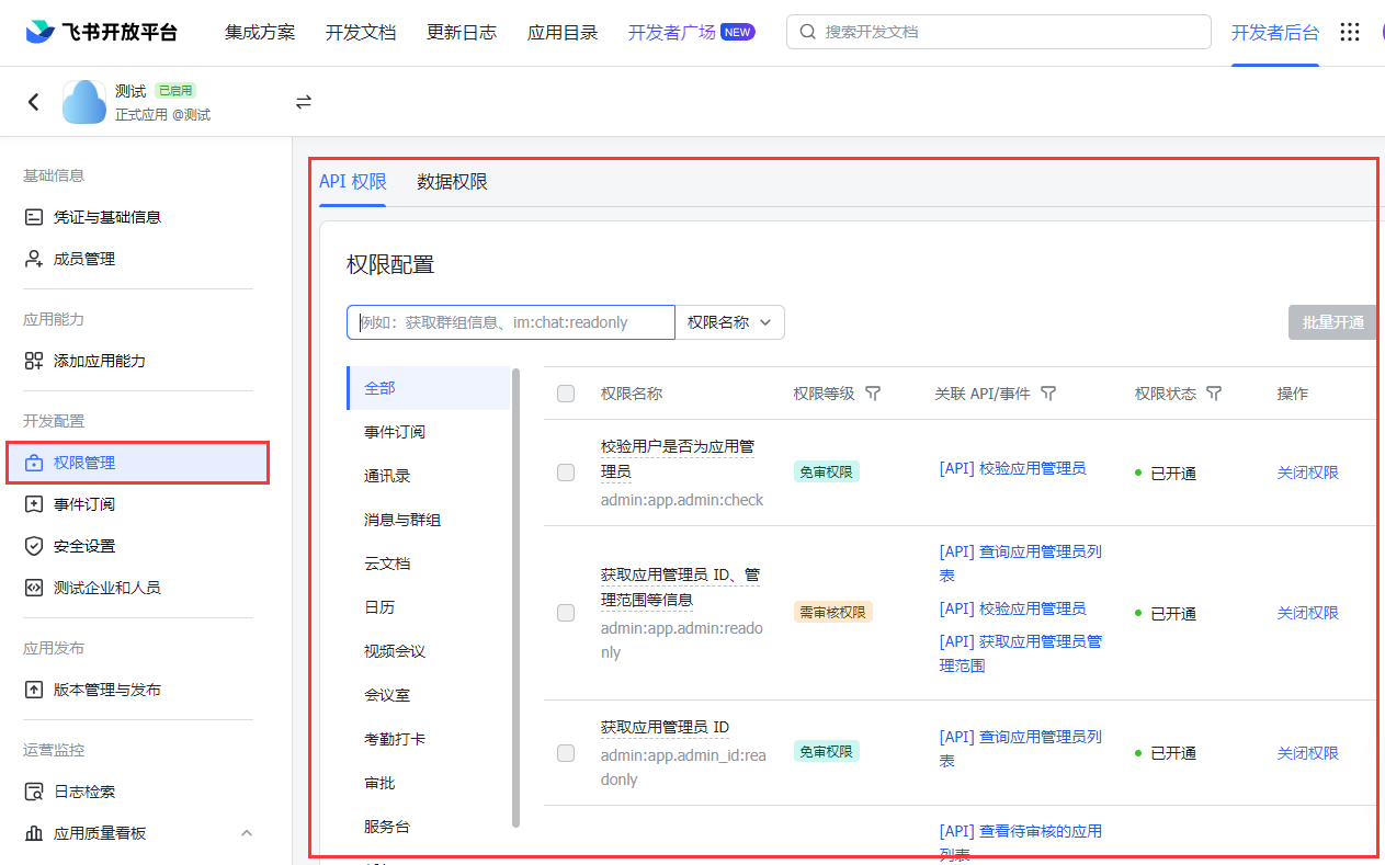 设置权限后需进行一次应用发布和后台安装飞书初始化,不然事件订阅>>请求地址配置时会验证不通过