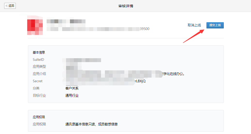 进入【应用管理】->【应用和模板上线】,点击提交上线按钮,耐心等待审核。 提交成功后,等待企业微信审核(约1~2天)。