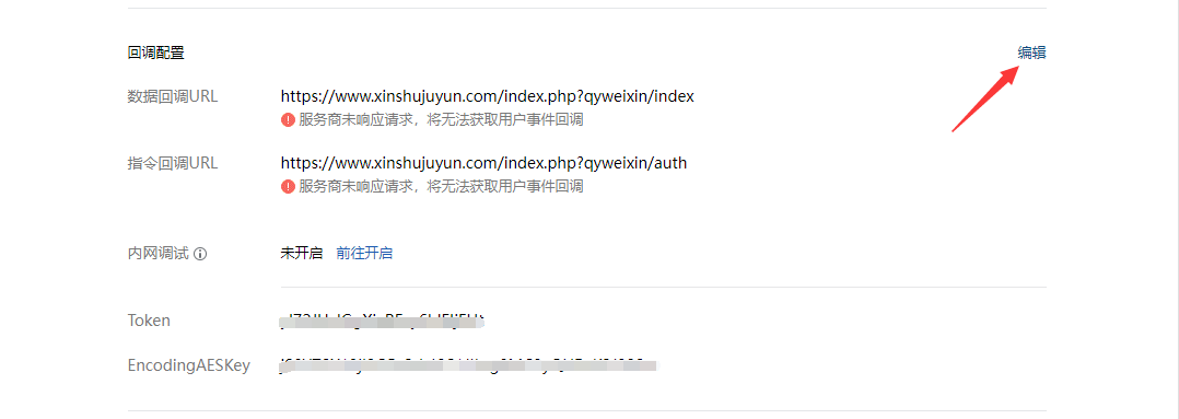 回到【应用开发】->【网页应用】当中,进入新添加的应用,找到回调配置,点击后面的编辑