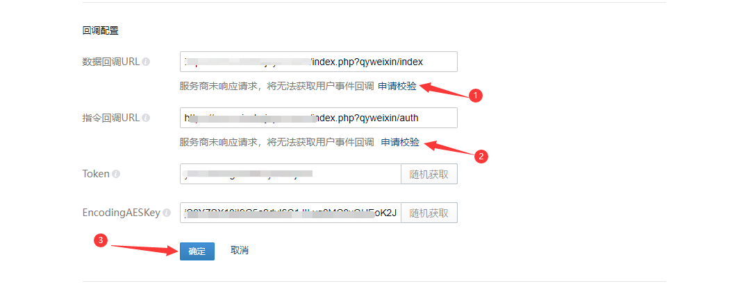 Token和EncodeingAESKey和第5步填写的保持一致