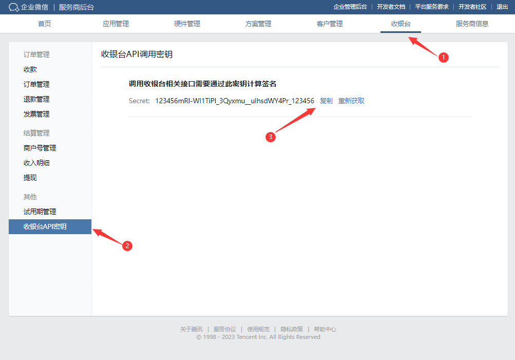 进入【收银台】->【收银台API密钥】页面获取收银台Secret
