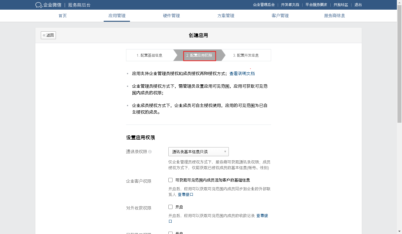 填写应用的基本信息、应用权限和配置开发信息