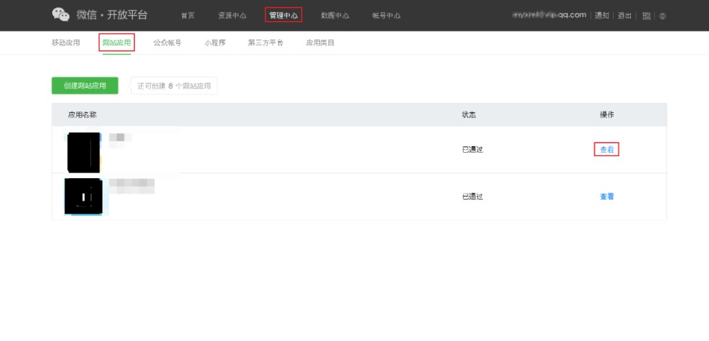 审核通过后,在管理中心->网站应用可以看到已通过审核的应用,点击查看即可看到应用的详细信息;