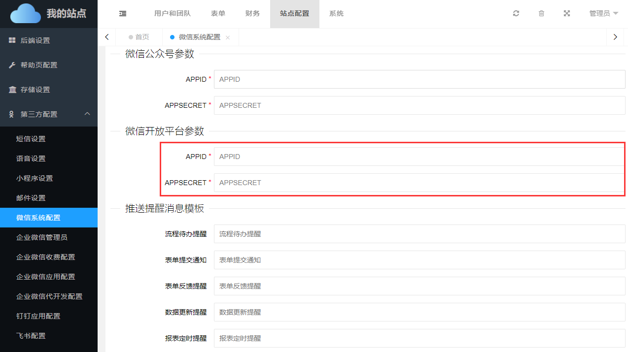 填写方式:进入管理后台后,在站点配置->第三方配置->微信系统配置中 填写到微信开放平台参数中。