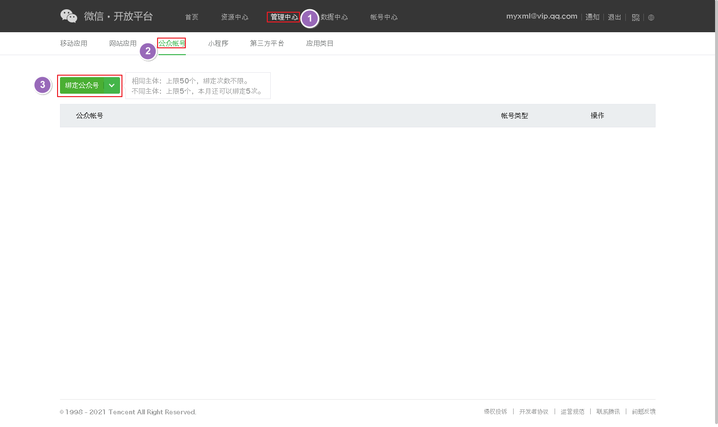 首先需要在微信开放平台登录后,进入管理中心->公众账号->绑定公众号->填写公众号账号密码->扫码验权