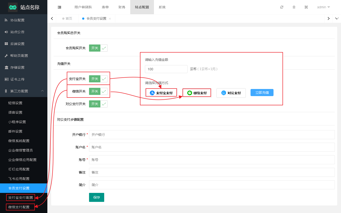 对公支付对应当前页面对公支付以及下方对公支付步骤配置设置内容。