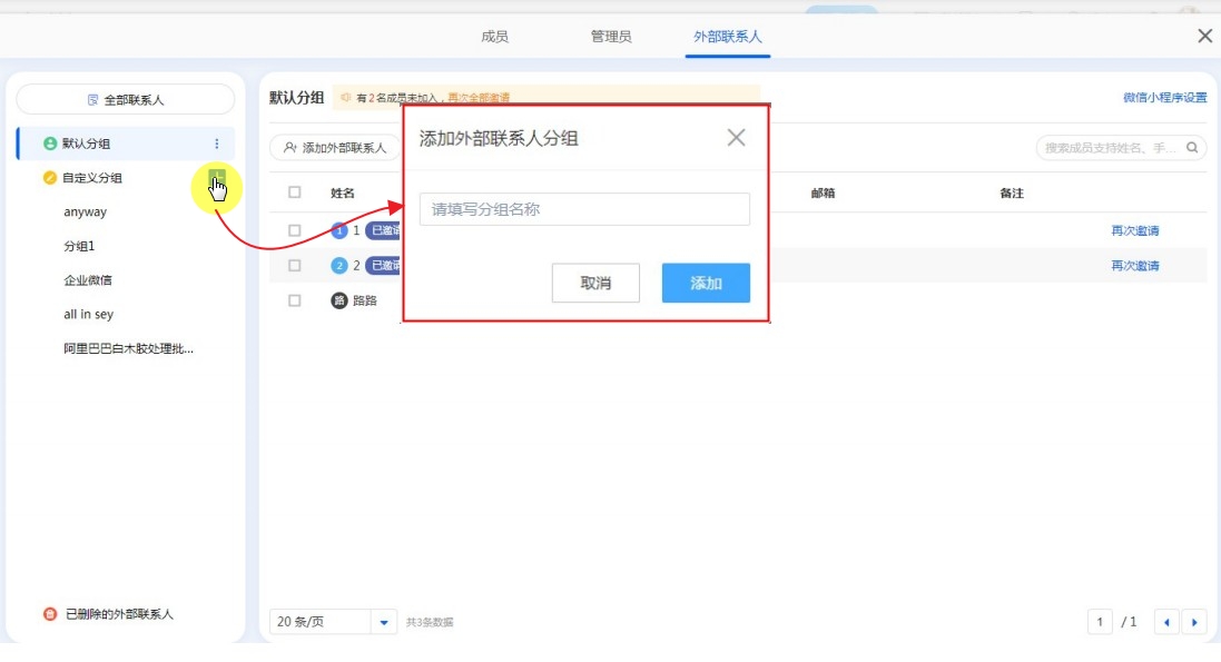 分组类似于内部组织架构中的部门,便于管理外部联系人。