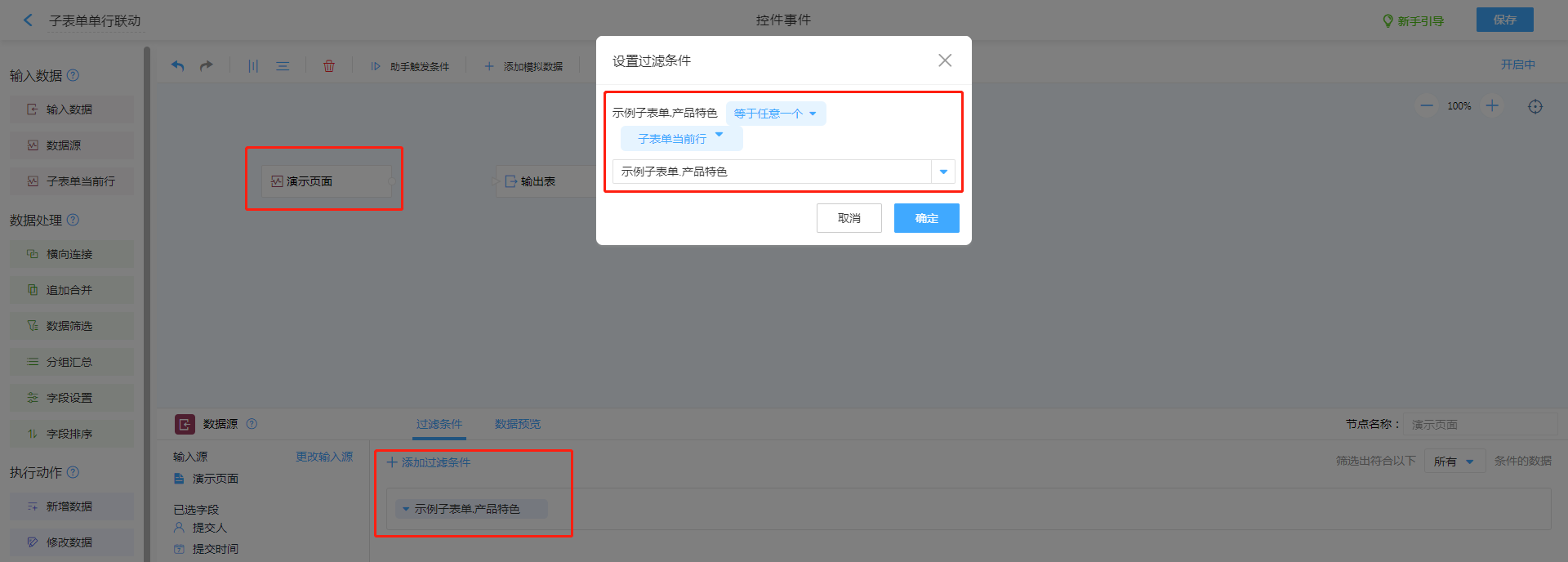 1. 输入数据选择数据源,找到需要关联的表单,选取需要关联的子表单数据