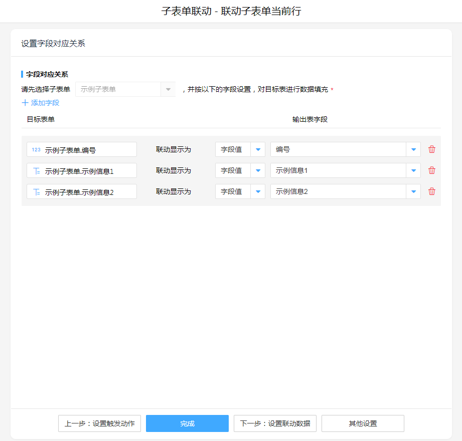 子表单联动,操作模式选择"联动子表单当前行",设置联动对应关系。