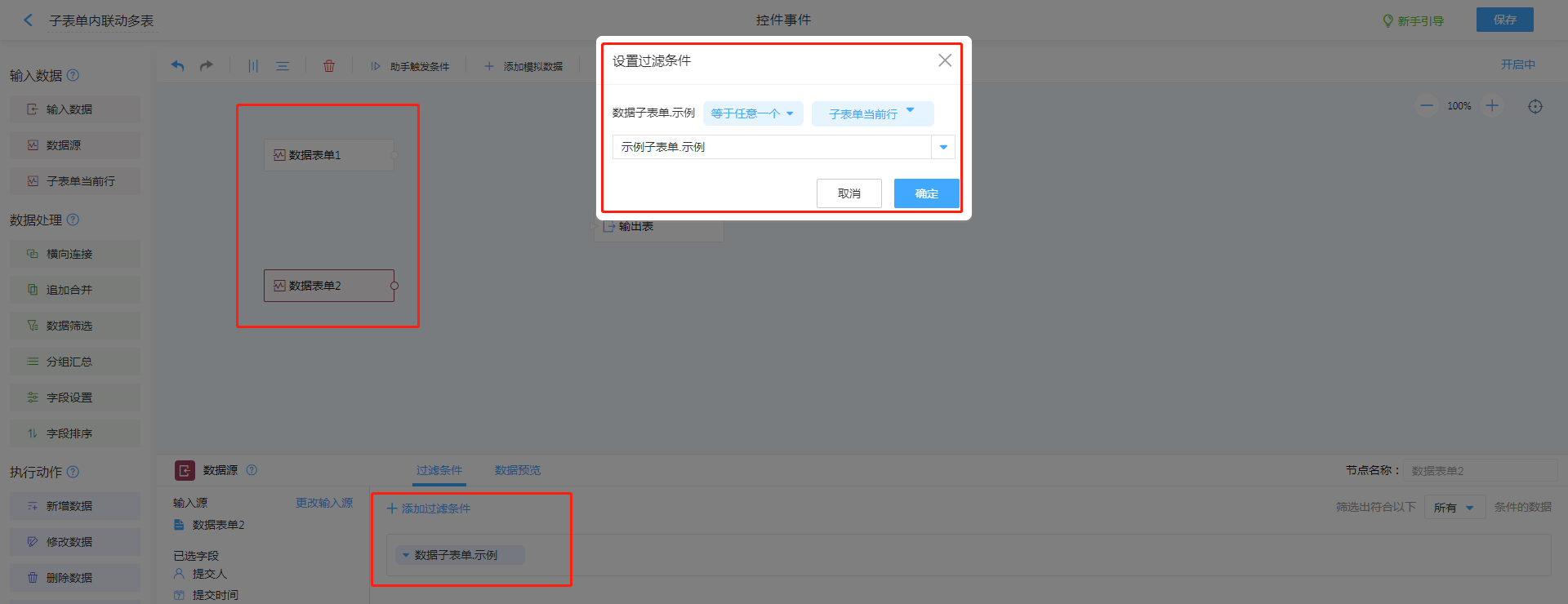 数据源,找到需要关联的表单,如果需要多个子表单之中调取数据,则需要将所有子表单均进行操作,列出多个数据源。