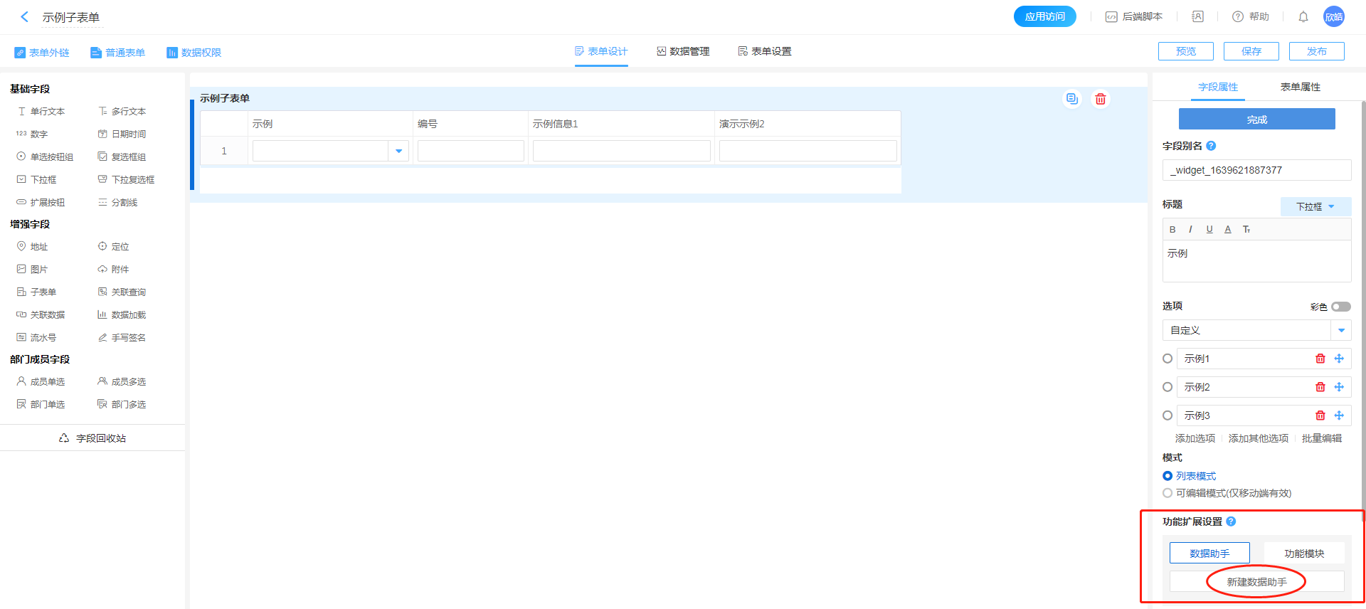 - 进入表单配置页面,找到需要进行触发目标控件(本案例以子表单内下拉框控件为例),点击进入数据助手配置页面。