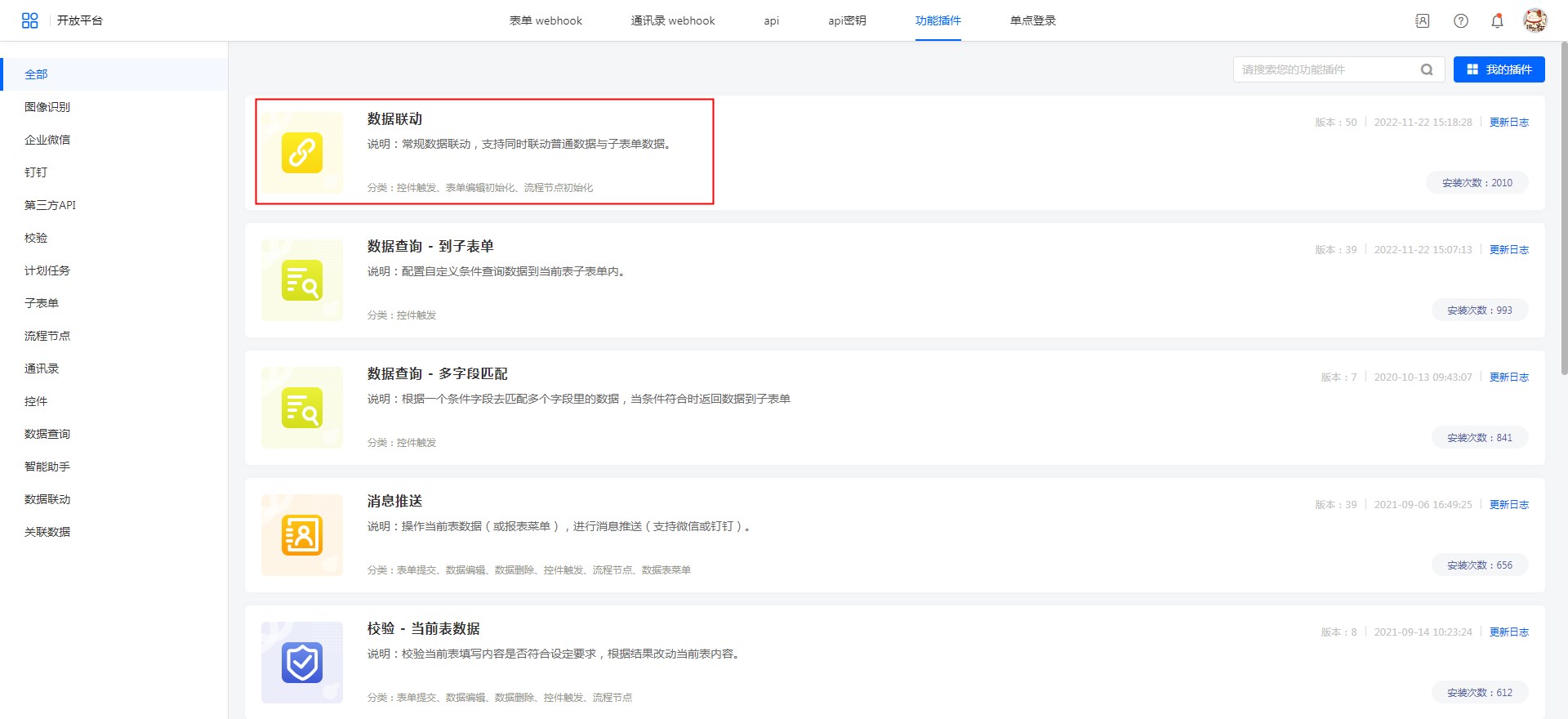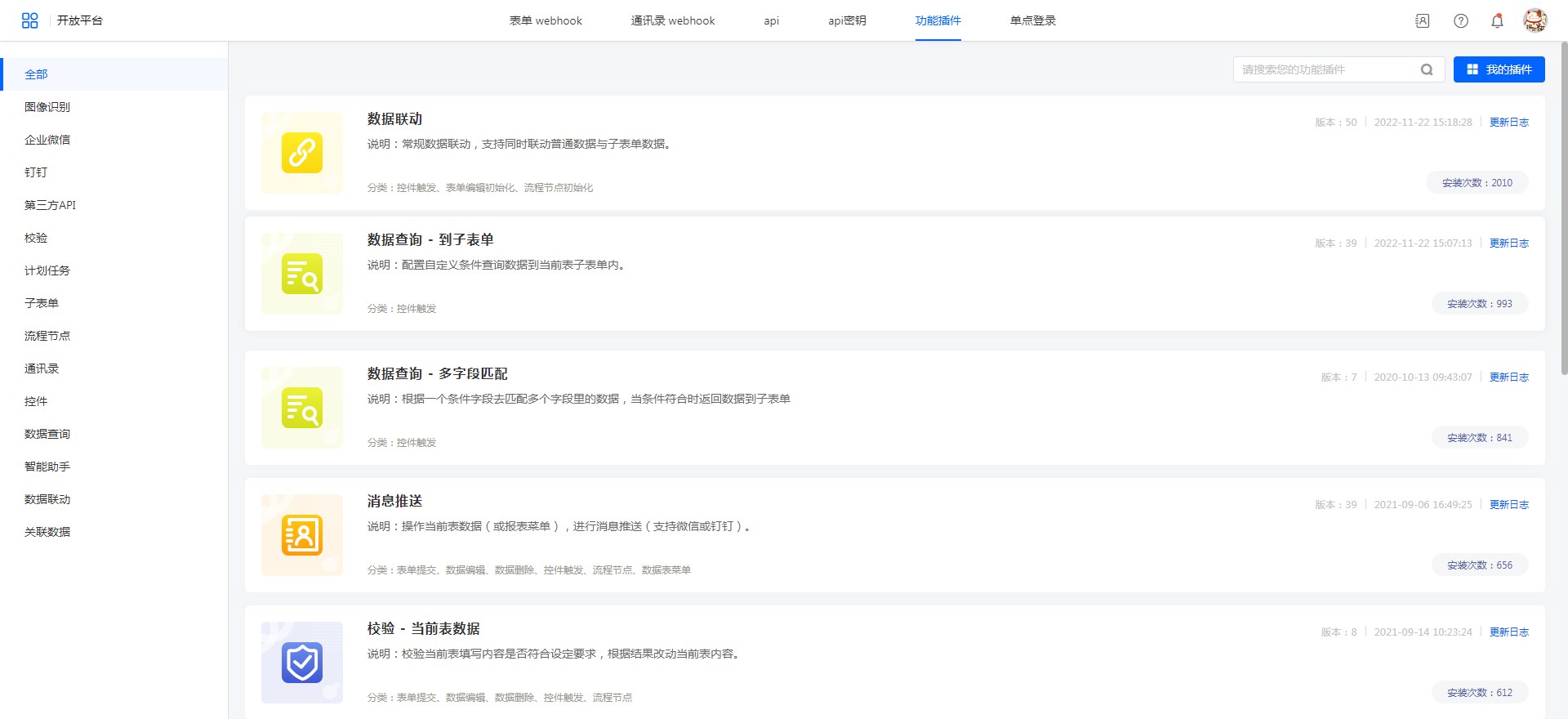 在使用过程中需要对功能插件配置进行修改时,可以点击功能插件名称进行配置调整,在完成配置调整并保存之后在页面右上角对表单执行保存操作即可生效。