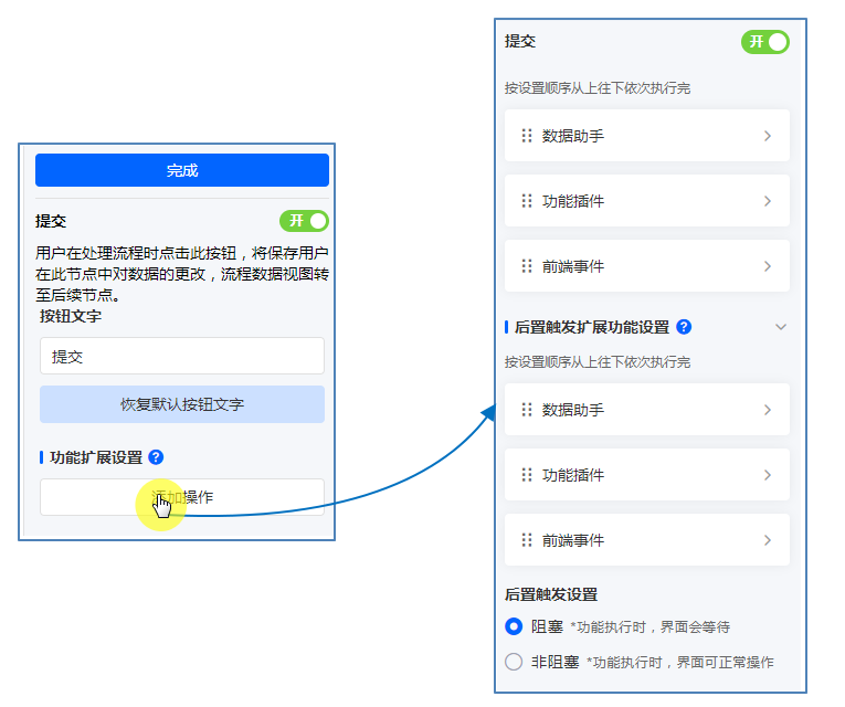 完成配置之后需要进行功能插件触发方式设置,对于流程功能插件目前提供两种触发方式:前置触发与后置触发,