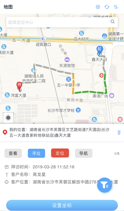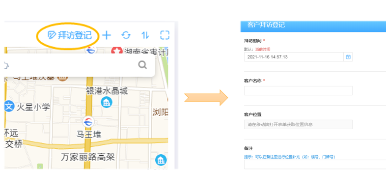 点击右上角的【拜访登记】可以添加客户的到访时间、名称等信息。在手机移动端可以直接通过地图获取客户的位置信息,一键添加到列表当中。
