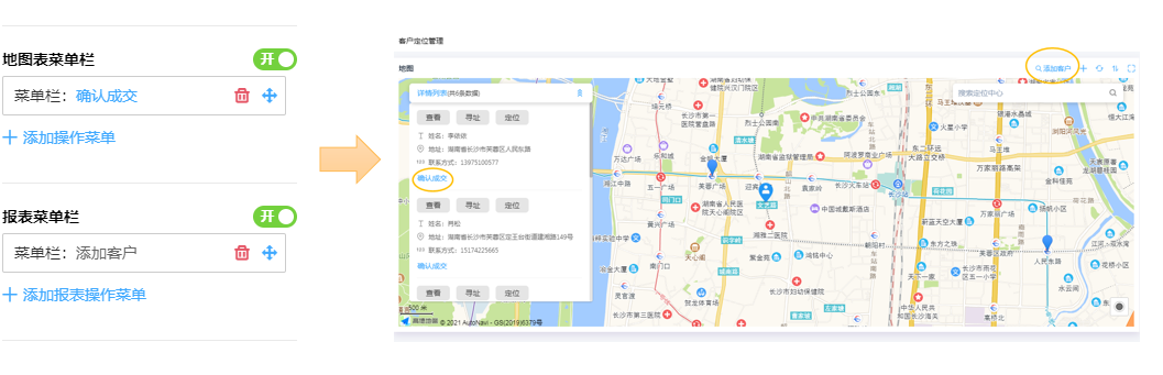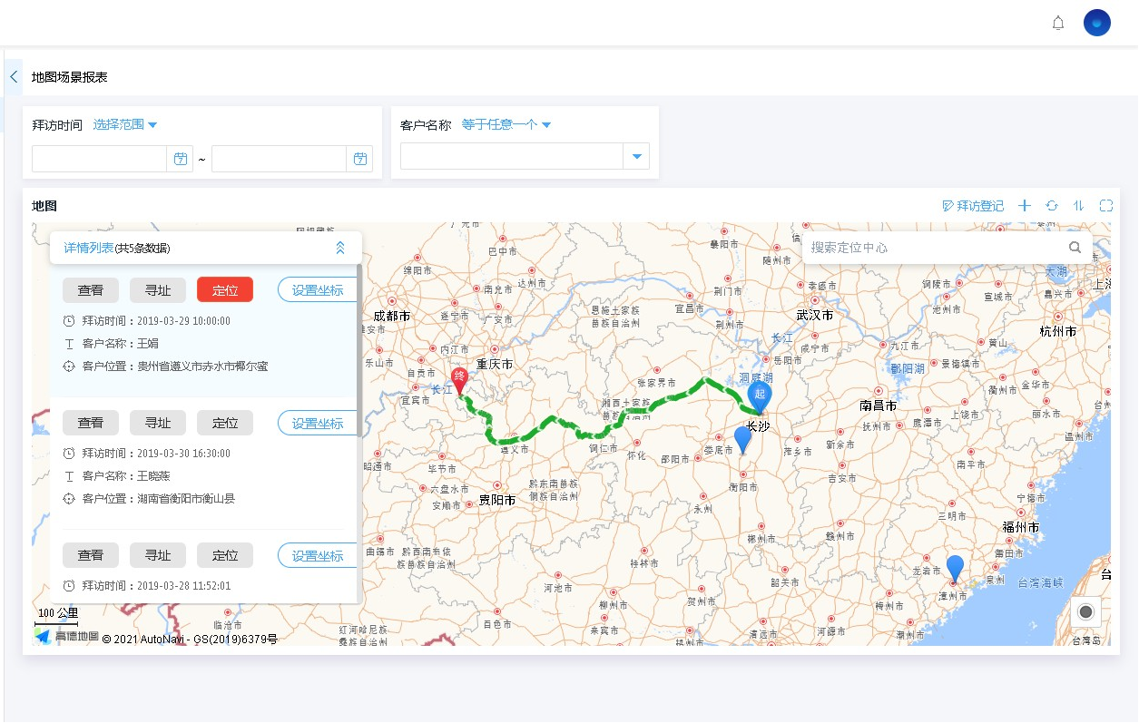 在crm客户管理系统当中,地图场景报表功能能够帮助企业更好的进行客户定位管理,有助于客户洽谈的时间、地点、行程安排。