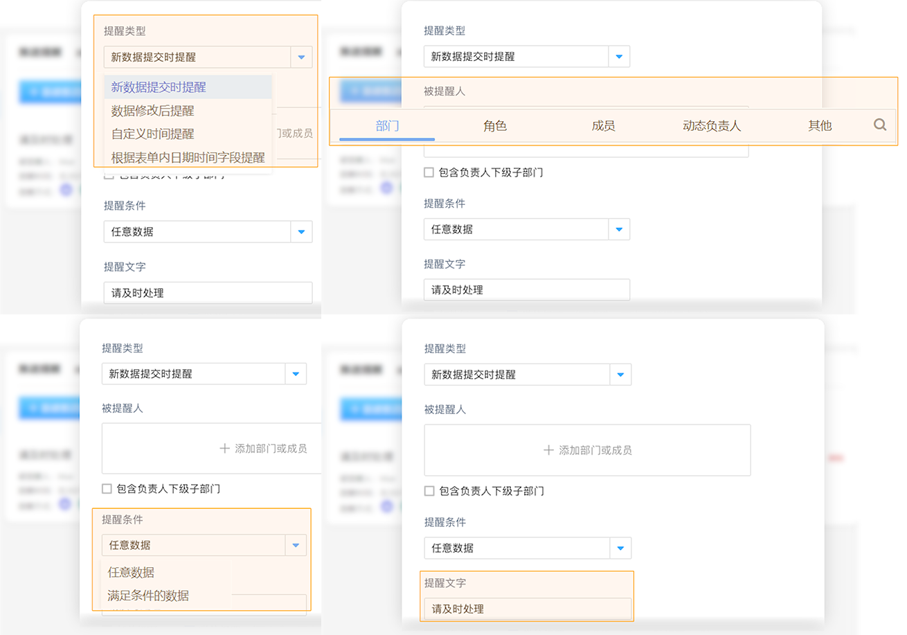「推送提醒」在表单、流程表单、数据助手三个入口均可进行设定,以便于用户在不同的业务场景下及时处理任务以及了解最新情况;