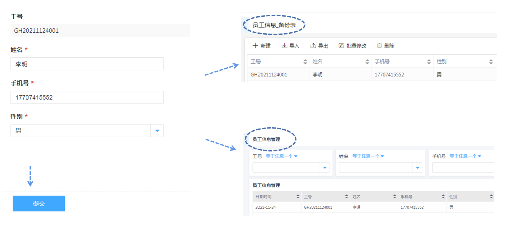 | 员工信息提交后信息管理与备份表单将同步新增 |