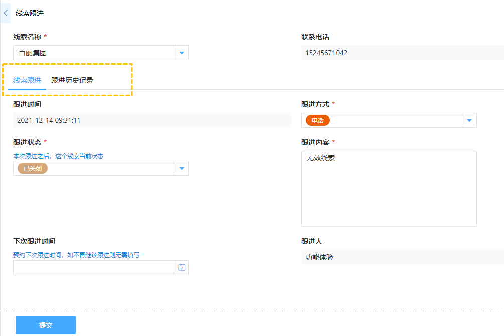 · 线索跟进中,通过多标签页的显示查看线索历史记录,分类管理各种销售线索,助力员工对线索的跟进和商机转化。