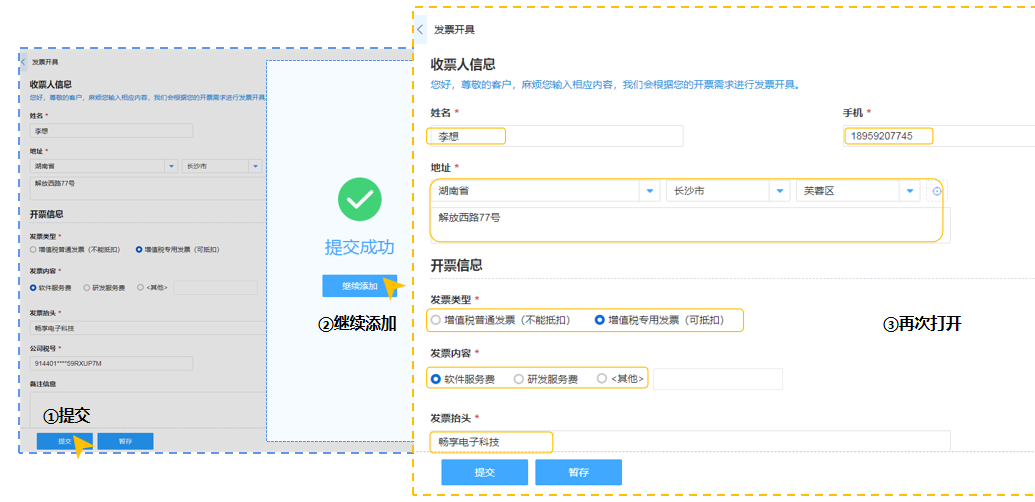 在申请发票开具填写收票人信息时,可以将发票抬头、税号、地址、联系方式等设置永久缓存,在下次开票时将自动显示,节省重复查找录入的时间。