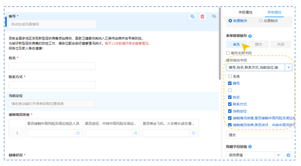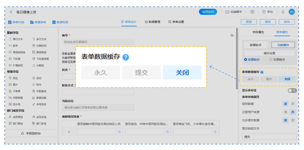 例如在社区每日健康上报的业务场景中,我们需要在提交信息后,回到表单还能看到最后一次提交的信息内容,我们需要设置的就是【永久】模式。