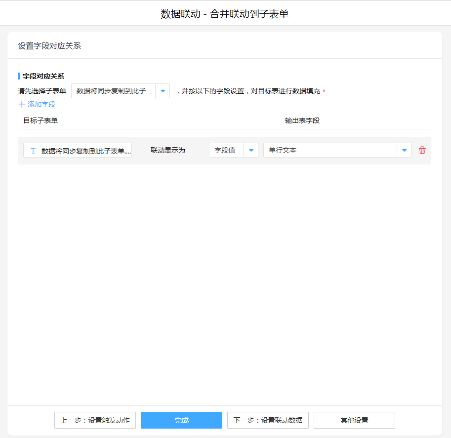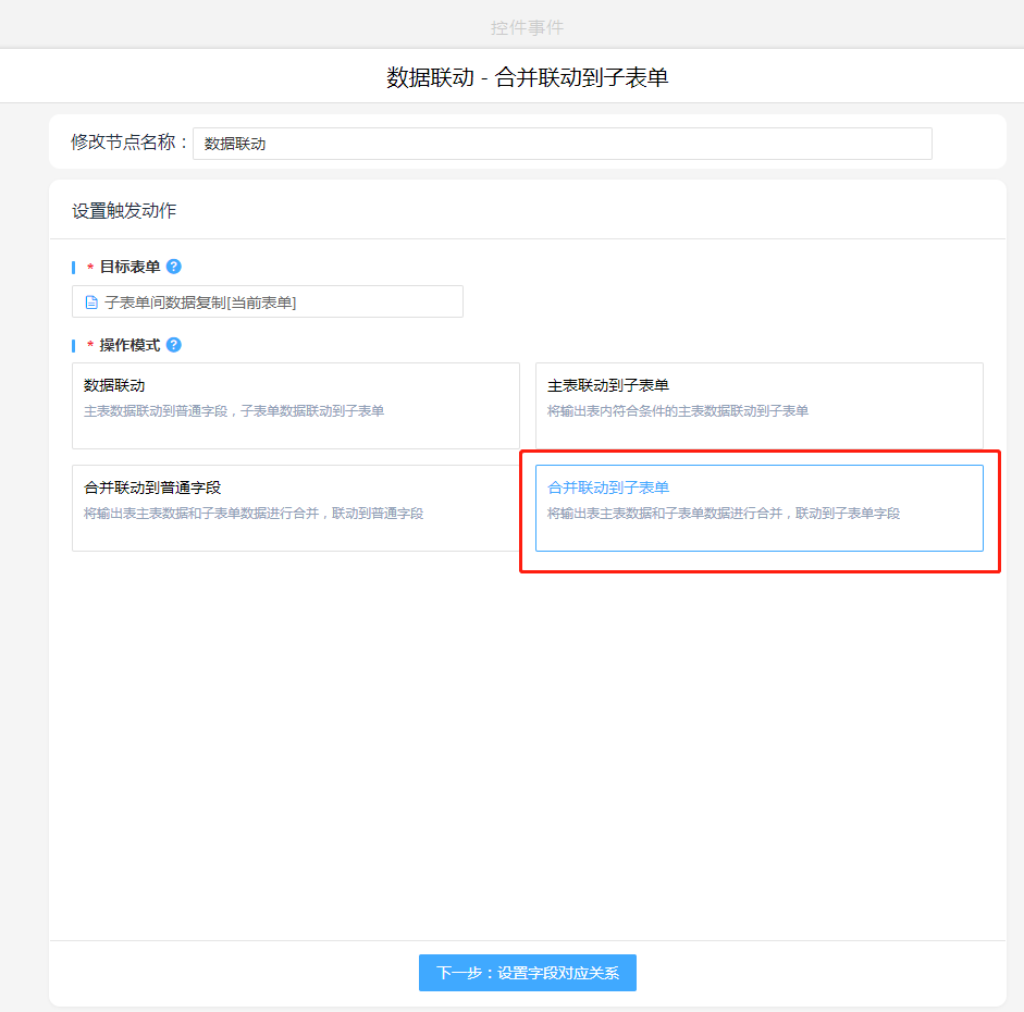 数据联动,操作模式选择:合并联动到子表单,字段对应关系中先选择子表单,再设置对应关系(只需要设置单个对应控件)。