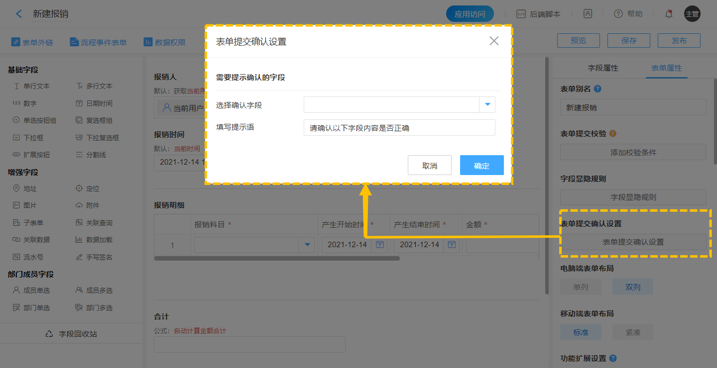 工作中需要做各种决策,尤其是每天都面对增、删、改、查工作时,如果因为操作失误造成的后果需要花费大量成本去挽回。比如提交了未完成、未检查的重要数据等,为了减少甚至避免对重要数据的误操作,可以使用表单提交确认设置,在提交表单的时候再次确认自己所做的选择,以免有误操作造成操作结果的偏差。
