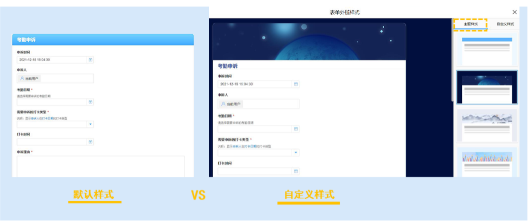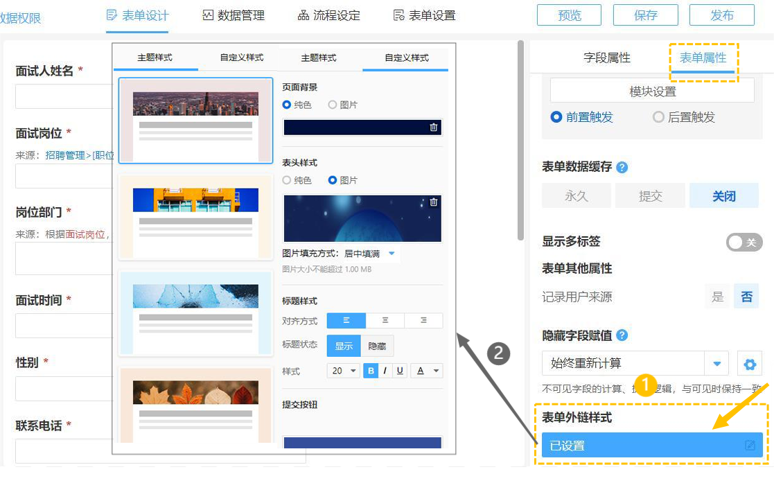 每个企业都有自己的品牌标识,通过表单设计>>表单属性>>表单外链样式的个性化设置,可以从第一视觉观感上树立品牌形象。一码通不仅提供了20多套主题样式可供选择使用,也可以由你自定义外链样式,借助视觉效果来更好的提升品牌辨识度。