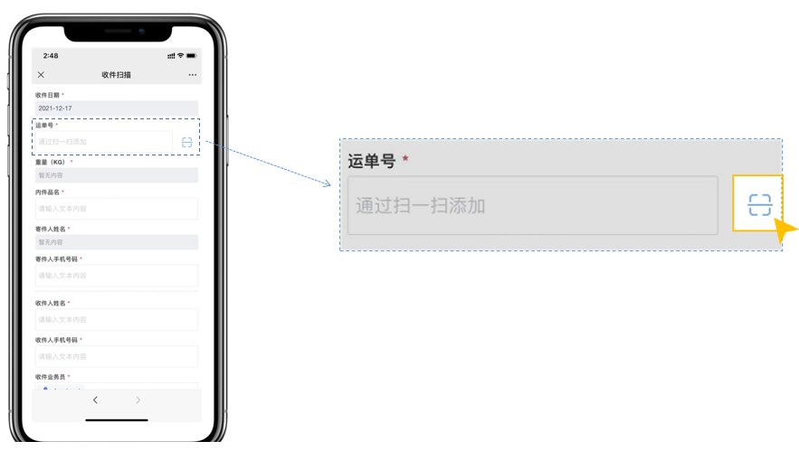 在一码通移动端后台找到物流派件跟踪系统,进入扫描表单中就能看到运单号的右侧有扫描提示。