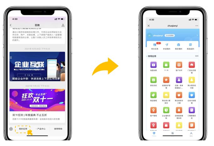 以一码通公众号为例,配置完成后,我们可以在移动端实现丰富的办公体验。在公众号的菜单栏点击我的应用即可进入到移动端工作台。