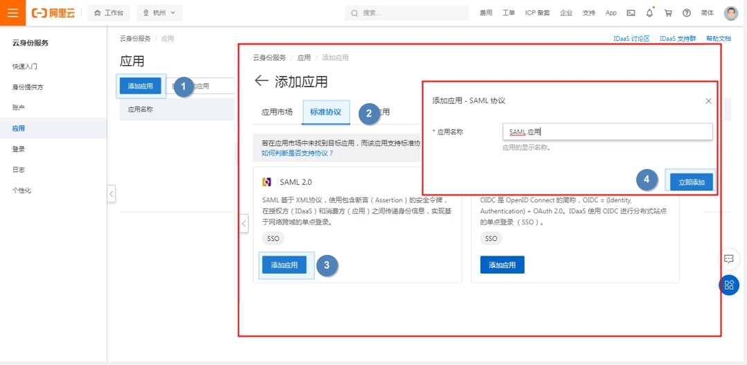 (2)进入云身份服务中,选择应用,在应用页面点击【添加应用】。