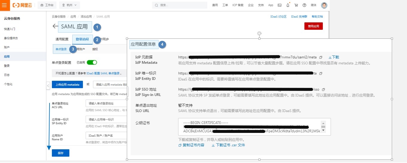 - IdP公钥:填入阿里云SAML应用>>应用配置信息>>公钥证书(Certificate)处的内容