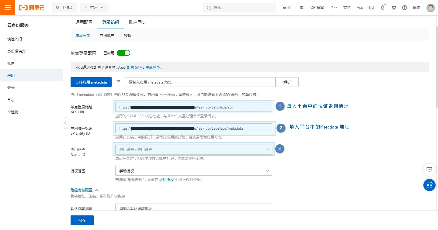 - 应用唯一标识(SP Entity ID):填入平台中的Metadata 地址