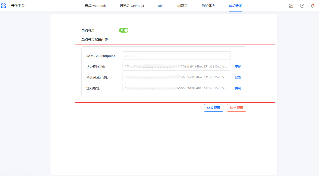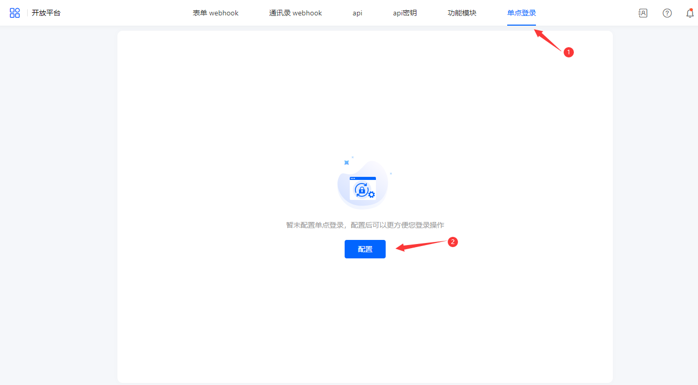注:需要根据应用配置信息去配置平台中的单点登录,建议不关闭当前页面。