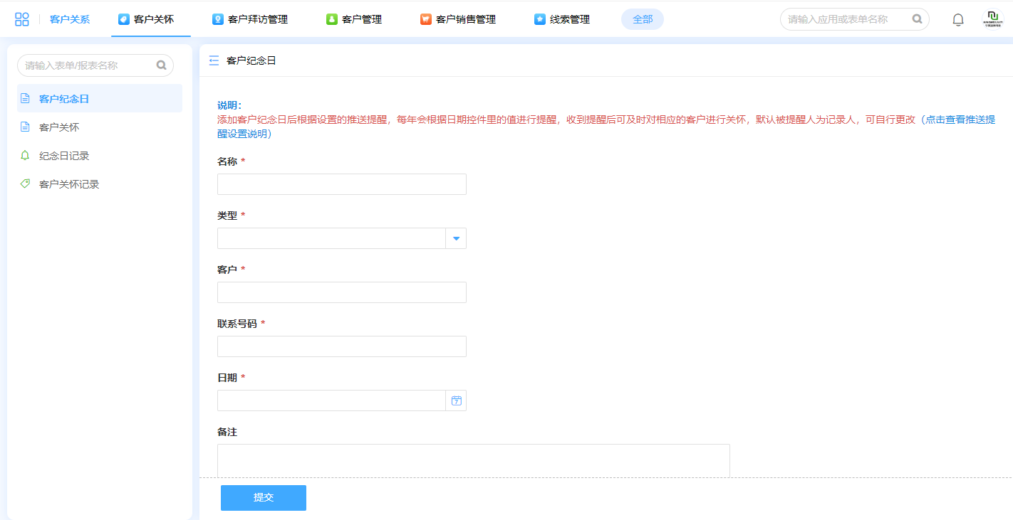 在关怀表单录入客户的基本信息以及重要日期例如:纪念日、生日等,日期控件经过设置可以在相应的时间向商务发送提醒,及时进行客户关怀。