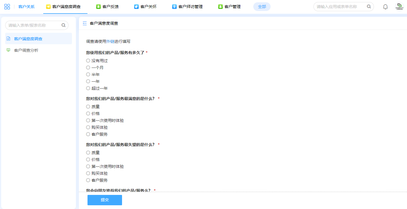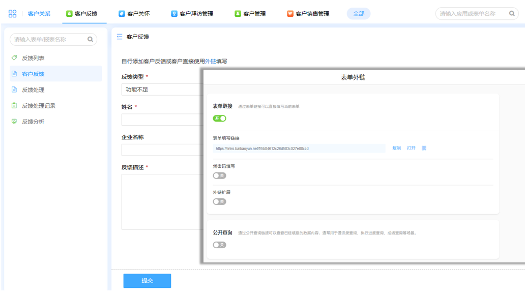 客户反馈意见收集除了相关人员自主填写外,还可以将表单外链发送给客户群体进行填写提交。