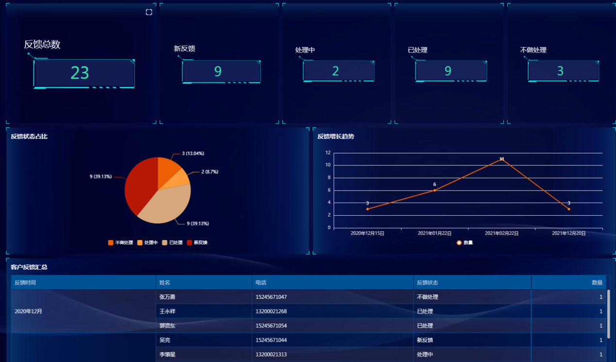 通过数字大屏能够呈现近期客户反馈的状态占比、反馈增长趋势等,便于及时调整响应的节奏,避免反馈积压过多降低服务质量。