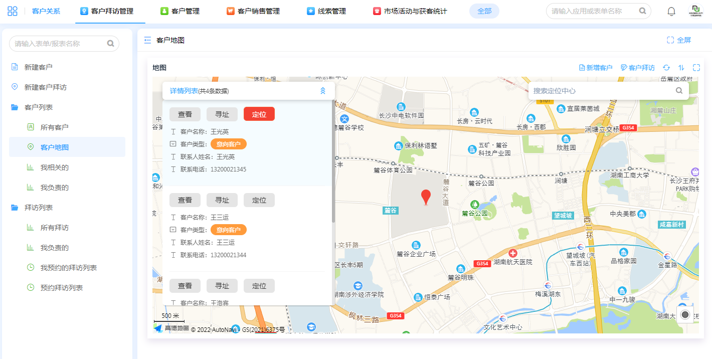 借助地图报表,可以快速获取拜访客户的准确定位以及交通路线参考。在地图报表的右上角可以一键新增客户/拜访客户,直接获取当前位置或搜索具体位置即可录入到地图报表中。