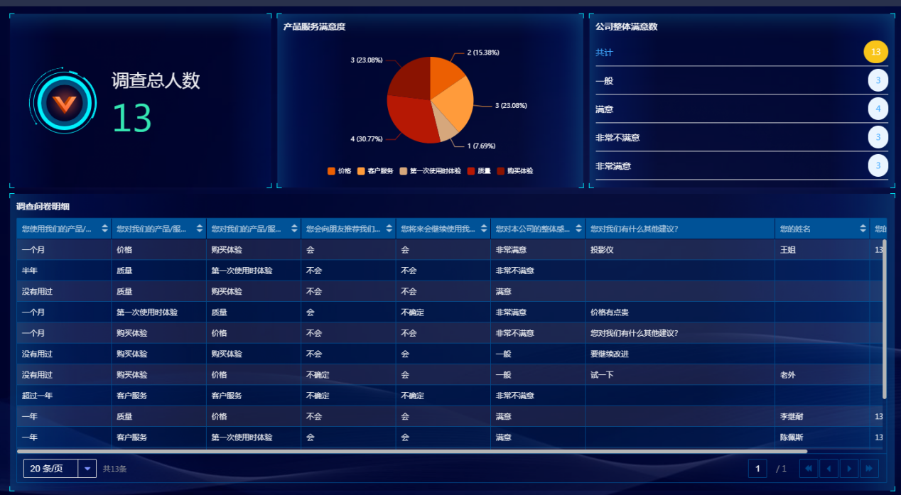 通过数字大屏各类型图表进行智能分析展示,使调查结果呈现一目了然。为商务团队阶段性工作复盘提供数据参考。