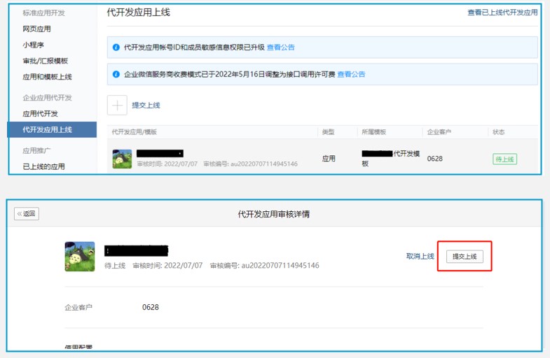 2) 审核通过后,进入代开发应用审核详情页,点击提交上线,确认正式上线企业代开发应用。