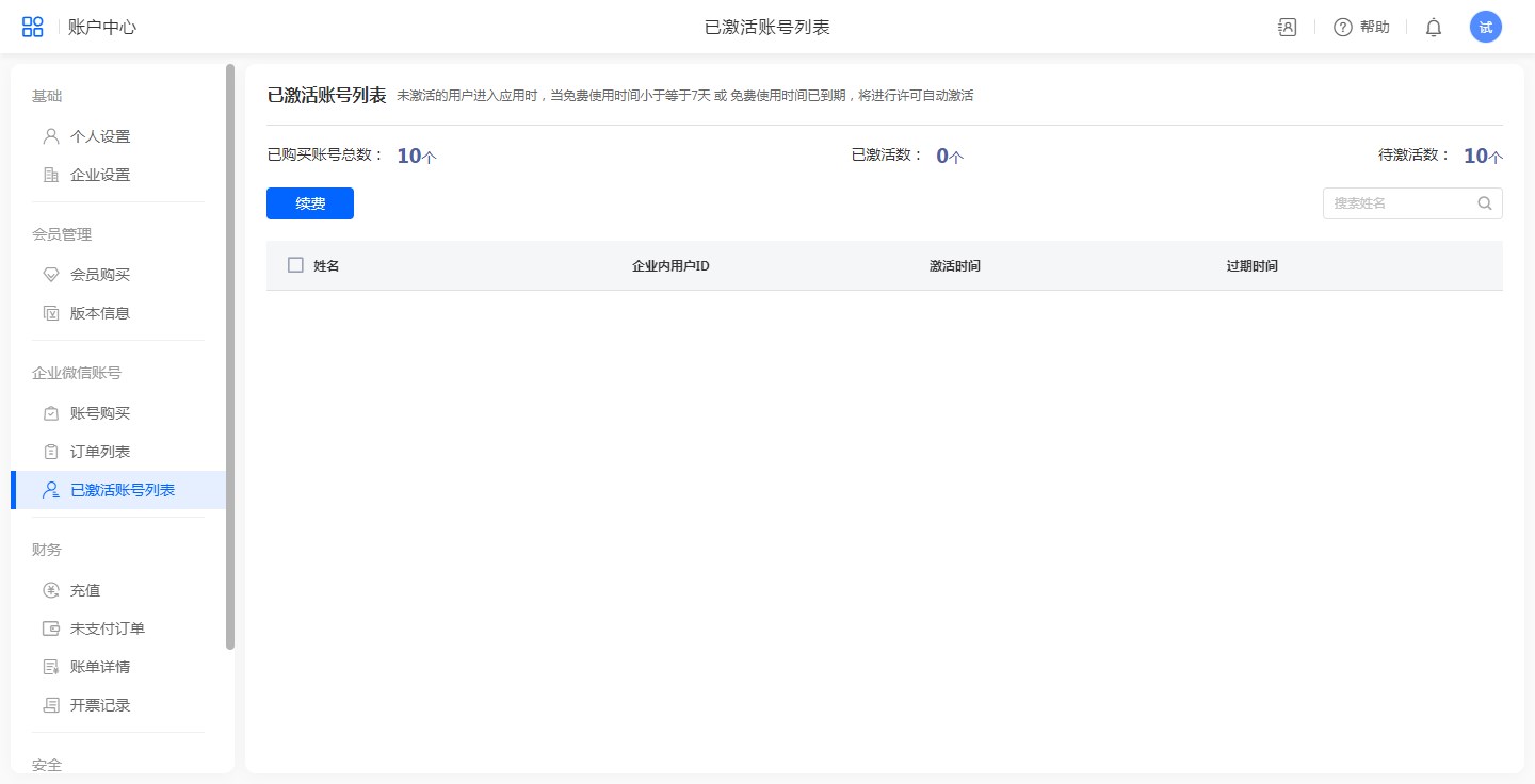 已激活账号可以进行续费操作。