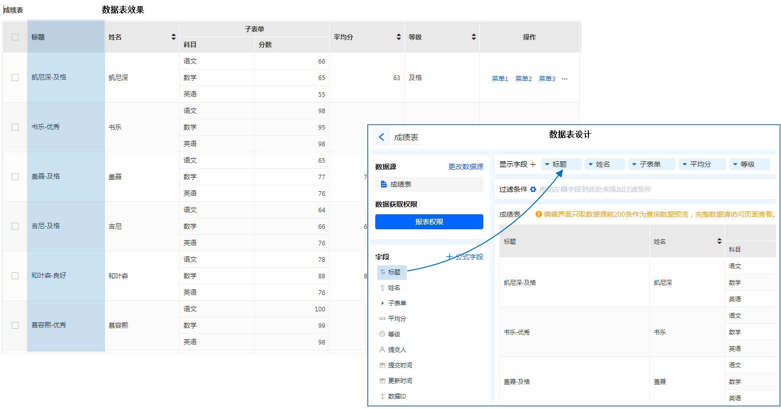 如下图,成绩表单的第一个字段是[姓名],则默认标题是[姓名]。