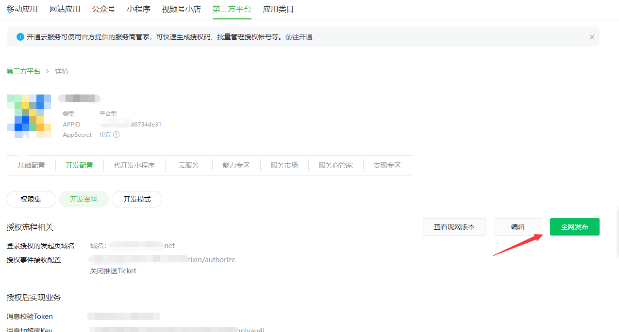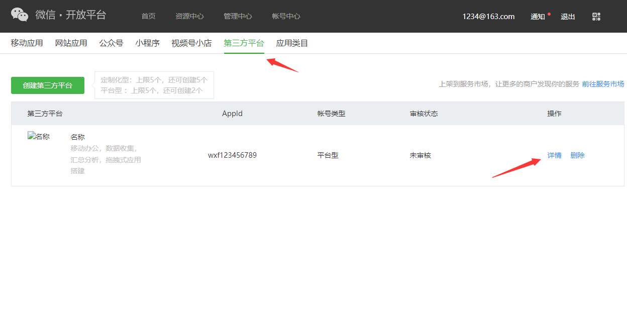 进入管理中心->第三方平台->找到刚才创建的第三方平台点击详情