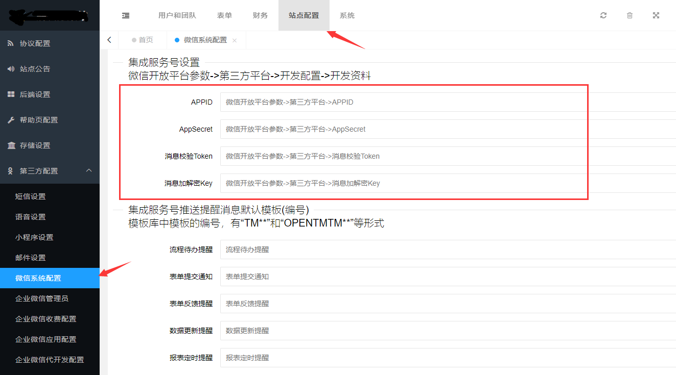 进入站点配置->第三方配置->微信系统配置,进行集成服务号配置