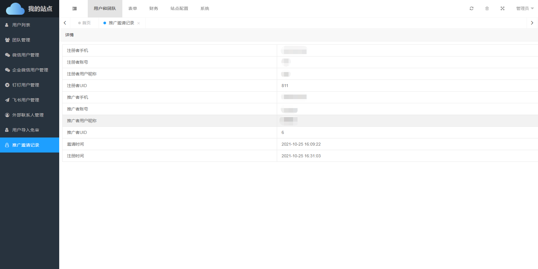 - 邀请时间:推广者邀请时间