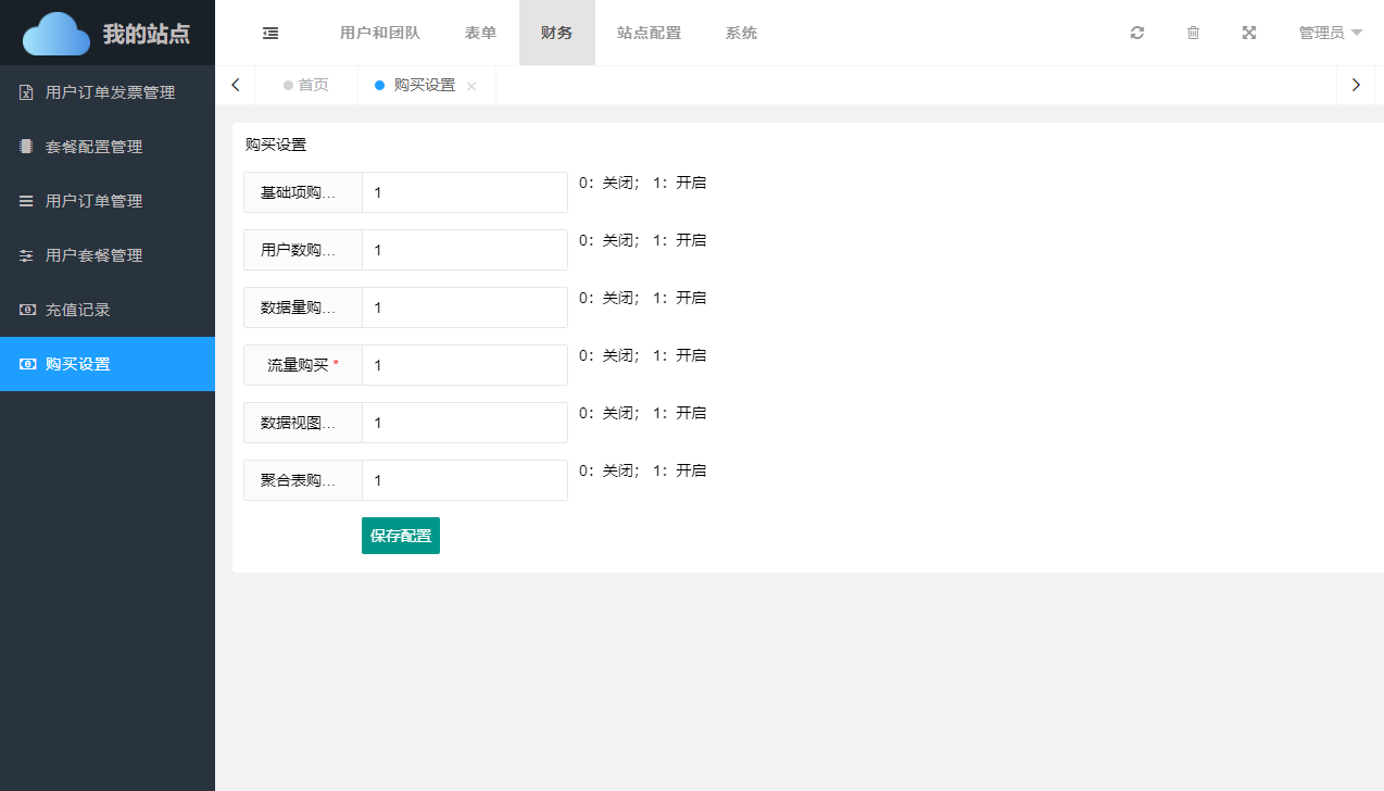 购买设置页面,主要是对会员购买基础套餐进行开关设置。