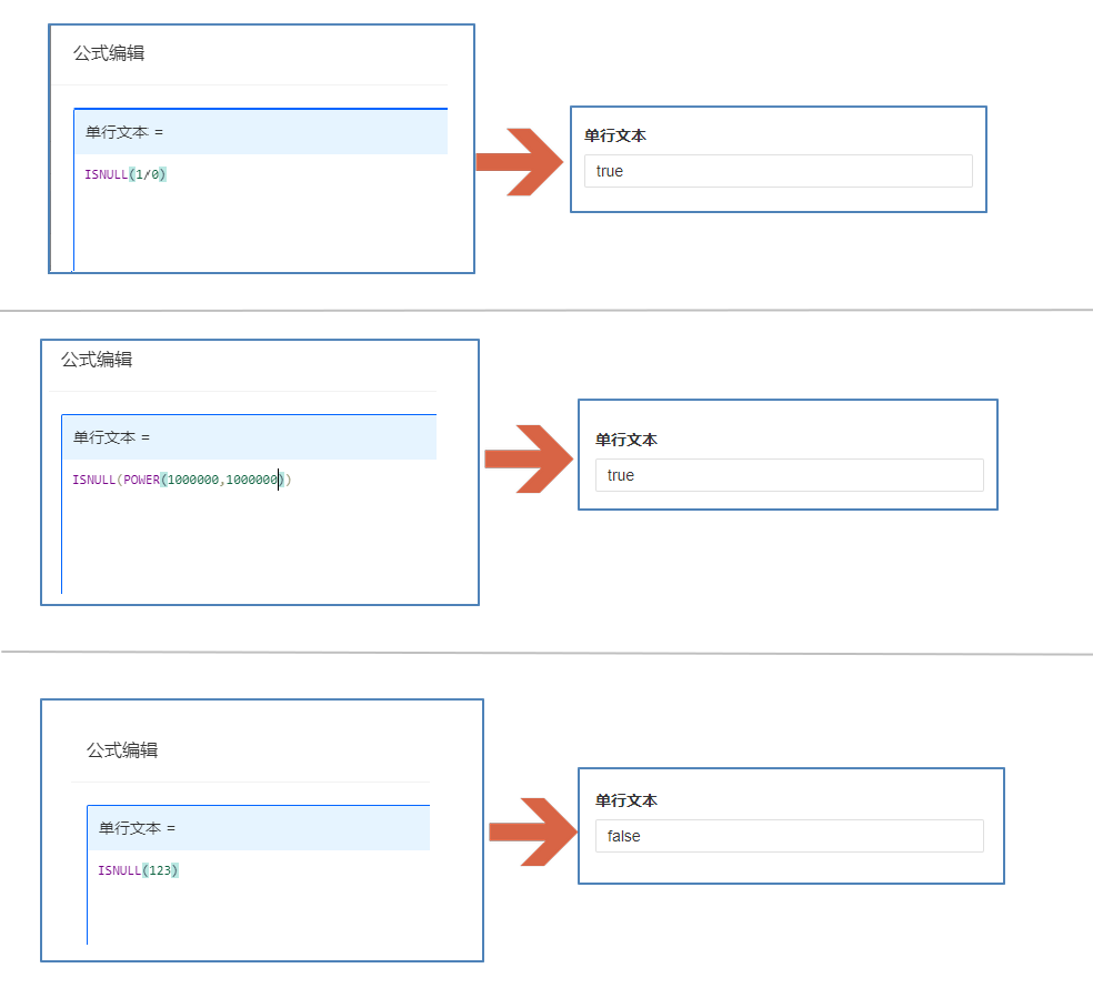 | ISNULL(1/0) | true | 参数计算结果无效,返回true |