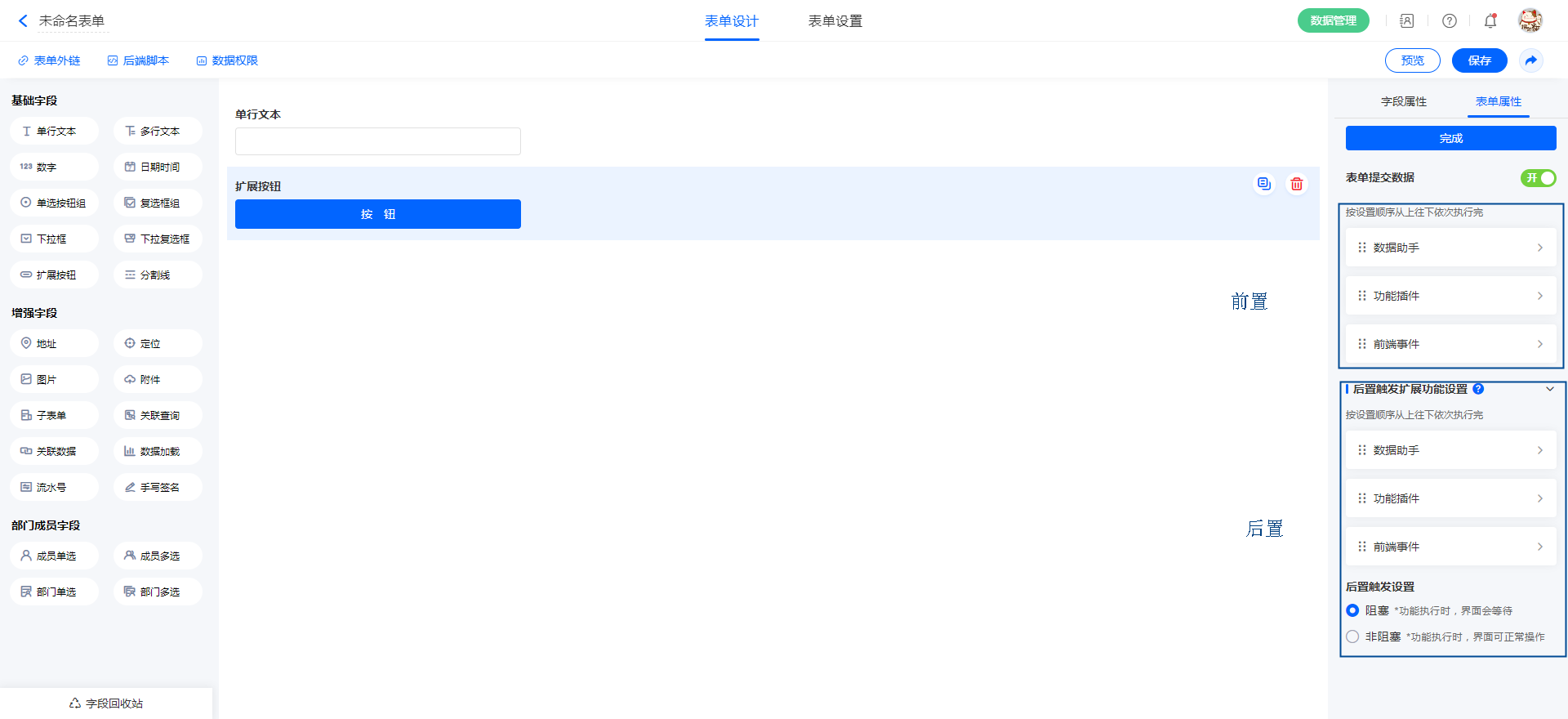 在表单提交数据/表单编辑数据/表单删除数据/流程节点属性等场景设置扩展体系时,可 设置前置&后置触发。