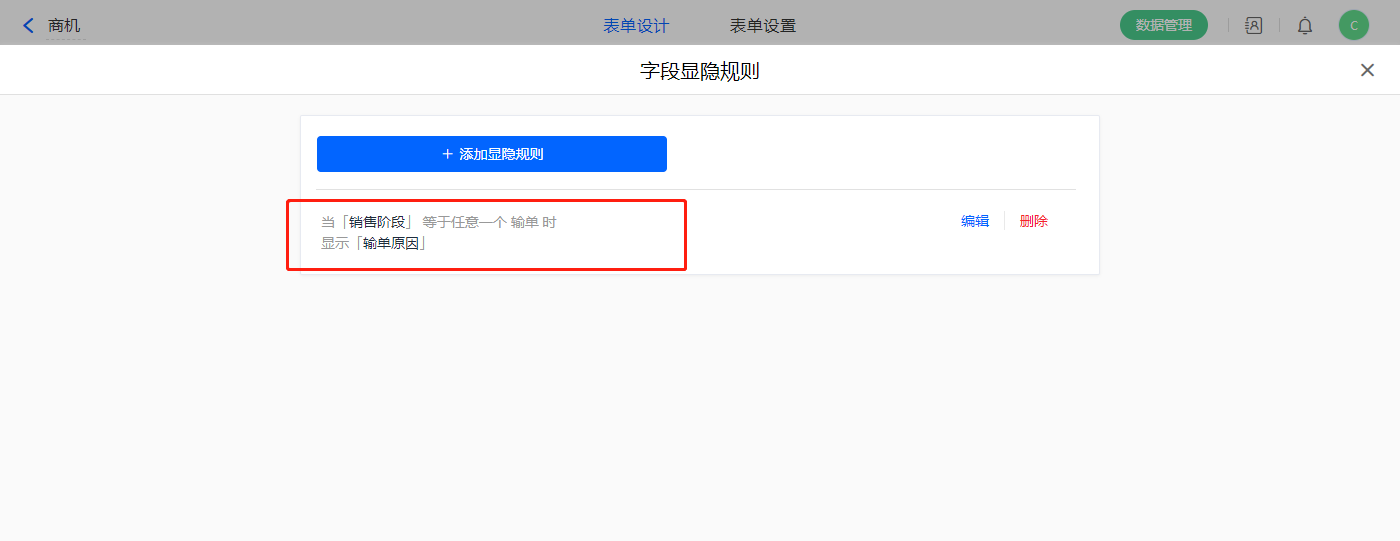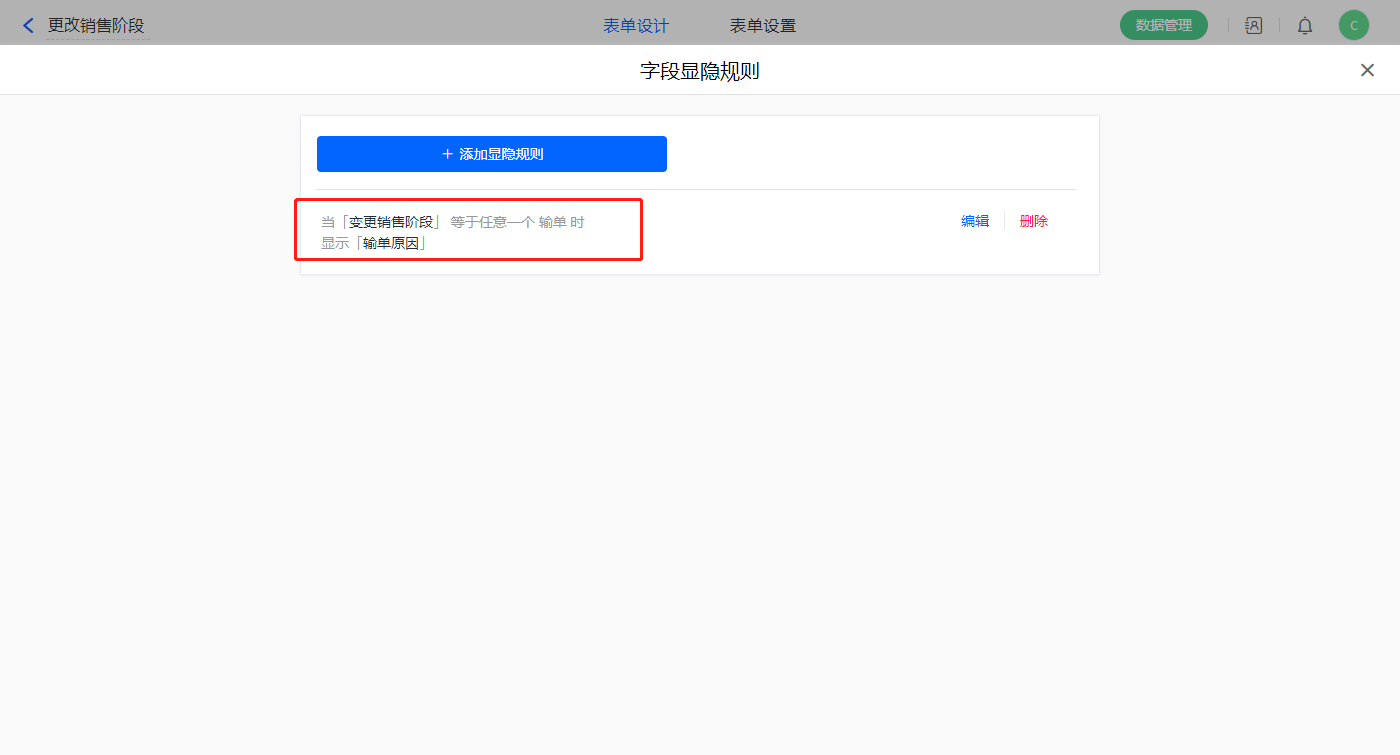 6)设置一条显隐规则,当【销售阶段】字段等于输单显示【输单原因】字段;