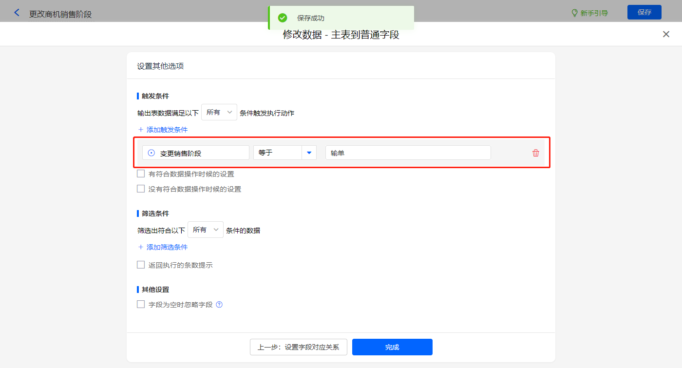 触发条件设置为当【变更销售阶段】字段等于【输单】,则修改主表【输单原因】、【销售阶段】、【阶段变更时间】、【阶段类型】四个字段的值;
